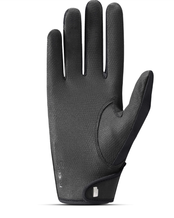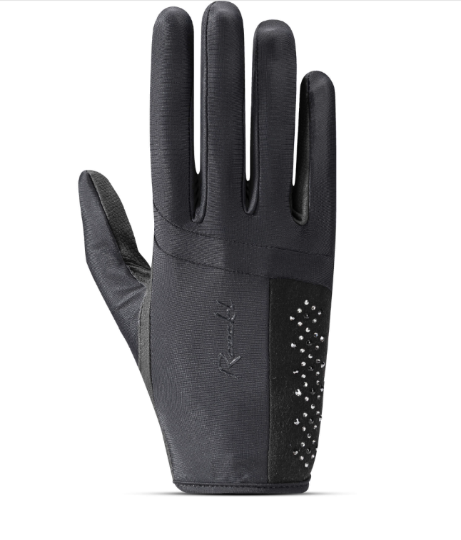 soft, stylish and lightweight riding gloves embellished with sparkling Swarovski crystals high-quality materials, thoughtful details and a sensitive grip Force-Line with Econyl yarn stands for a lightweight, super-stretchy, recycled quality material with a sophisticated look Roeck-Grip is a fine, super-grippy Roeckl Sports PU fabric – elastic, breathable and skin-friendly practical Velcro fastener for fine-tuning at the wrist touchscreen compatible ideal for use with leather and webbing reins machine washable up to 30 °C do not use fabric softener or bleach do not tumble dry